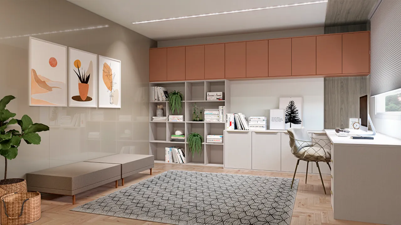Composição equilibrada para trabalho e foco, com estética acolhedora e marcenaria funcional.