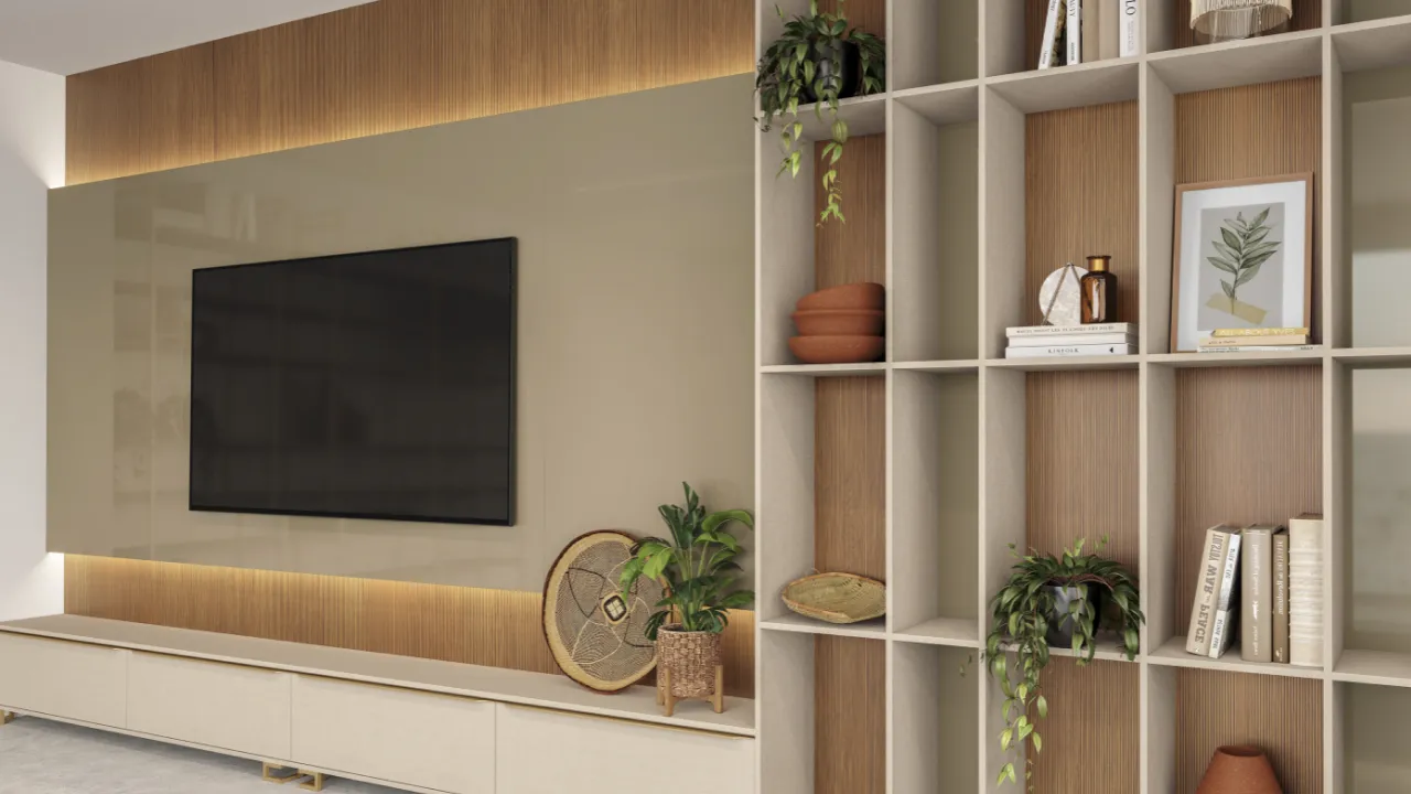 Soluções de armazenamento que se integram ao design da sala, criando um visual coeso e sofisticado.